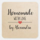 Modern "homemade with love" sticker with a black font on a cardboard background embellished by a cute red heart. Customise text.