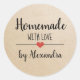 Modern "homemade with love" sticker with a black font on a cardboard background embellished by a cute red heart. Customise text.