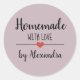 Modern "homemade with love" sticker with a black font on a purple background embellished by a cute red heart. Customise text.