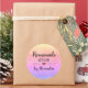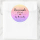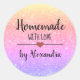 Modern "homemade with love" sticker with a black font on a rainbow glitter background embellished by a cute red heart. Customise text.