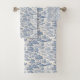A pastoral toile de jouy pattern of houses, trees, rivers, and people combine to make a beautiful and elegant towel set.