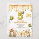 A sweet Birthday theme with bees, honey bear, a hive, little bird and yellow flowers on the front and another honey bear on the back! You can personalise this invitation with your details.