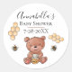 These sticker labels feature a cute bees and honey theme. A cute little bear eating honey is pictured at the bottom with two bees buzzing near. Illustrated honeycomb accents the text area in the centre. A sample name is printed above an event, "Baby Shower" followed by the date of the celebration. You can personalise the stickers to include your own party information or other custom text.