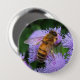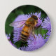 This button features a honey bee pollinating lovely soft blue and purple ageratum blossoms.