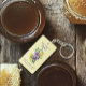 A cute bumblebee gently sits among two delicate lavender flowers and fresh green leaves, all set against a soft creamy yellow backdrop with yellow honeycomb design