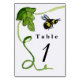 Art features a watercolor of a green vine with a leaf. A picture of a buzzing honey bee is above the table number. Words note "Table 1" but can be personalised with your own words and messages. Create your own unique one-of-a-kind table card design by customising these template garden bugs insects cards for your wedding, reception, or other personal event information.