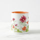 A bright colourful coffee mug decorated with red painted daisies, orange nasturtiums and a honey bee painted in watercolor.