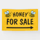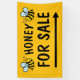 Honey for sale banner sign for beekeeper business. Includes pointing arrow for giving directions where to go. Rotate arrow for left or right way. Sell honey and related products from own apiary, garden, home, farm, market, shop, grocery store, office, company, business, homestead etc. Simple noticeable road signage with bumble bee logo and yellow background colour. Apiculture marketing materials.