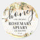 Elegant vintage honey jar stickers featuring yellow and gold glitter agate crystal edges, a sweet honeycomb background, honey drips, white watercolor florals, bees, and your apiary details.