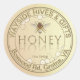 Your apiary name is displayed in a curved edged border along the top of label with the location along the bottom edge of label. The word HONEY is written in a beveled metallic font and the text is reflected and faded beneath the word. Honey net weight appears below the label in ounces and grams. A stylised gold honeybee and delicate honeycomb pattern surrounds the word HONEY.