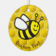 Smiling flying bee cartoon over seamless bee-hive background. Custom text on both sides.