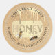 Kraft label features several realistic honeybees with honeycomb patterned background and honey drips. Stylised border adds an elegant touch.