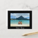 Postcard with a honeymoon couple on the white sand beach of a luxury overwater bungalow resort in the clear blue lagoon of the tropical island of Bora Bora, near Tahiti in the pacific archipelago French Polynesia and the text: 'Bora Bora'.