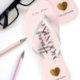 Trendy Honeymooning Typography Blush Pink and Black with Name and Dates and Faux Gold Heart Flip Flops.