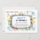 Cute boy's transport birthday invitation featuring a few watercolor trucks and cars on a grey circular road. The design also features some signs, trees and clouds. This transport themed boy's birthday invitation is ideal for a first, second or third boys transport birthday party.