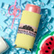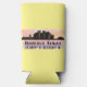 Seltzer can cooler features Honolulu Hawaii city skyline silhouette with watercolor splash and latitude & longitude map coordinates on yellow background.
