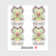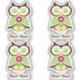 Hoot Hoot! Adorable set of four green spring owls floral Sticker. A cute design that displays a set of four green and brown owls each one holding a pink flower. Brown polka dots cover the green wings. The text: Under the image of each owl there is the text "Hoot! Hoot!". Some elements by Trina Clark.