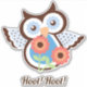 Hoot Hoot! Adorable spring owl floral Sticker. This cute design features a blue and brown owl with coral flowers. Polka dots cover her wings. The text: "Hoot! Hoot!" is under the image of the owl. Some elements by Trina Clark.
