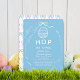 This coquette "Hop on over" boy's baby shower invitation features hand-drawn bunnies and a basket with Easter eggs framed by a bow frame on a sky blue background. The reverse side features a white background with a baby blue bow pattern. Personalize it for your needs. You can find more elephant products at my store.