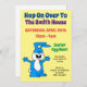 Hop On Over For An Easter Egg Hunt cute invitation. It features a cute, happy and excited blue bunny on a yellow background with colourful type. A great invite for an Easter Egg Hunt.