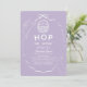 This coquette "Hop on over" baby shower invitation features hand-drawn bunnies and a basket with Easter eggs framed by a bow frame on a lavender/purple background. The reverse side features a white background with a purple bow pattern. Personalize it for your needs. You can find more elephant products at my store.