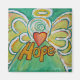 The word for "Hope", is painted in golden yellow shades with red accents. The green angel has white and gold wings with light pink for contrast. The acrylic painting has sparkle from a light layer of glitter. This angel art painting is a reminder that you are supported and loved more than you know.