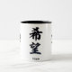 Kanji symbol for Hope adorns this coffee/tea mug. Om symbols also are on each side of the Kanji symbol. These mugs are available in many styles, sizes and colours. Enjoy and Namaste.