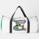 This white duffle bag features a humourous cartoon of a frog wearing sunglasses, relaxing in a beanbag chair with a drink, and the text "Hopelessly Relaxed." This design is perfect for those who embrace leisure and a laid-back attitude. Edit colour of the bag caps and body in the Design tool to your favored colours.