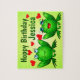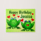 Hoppy Birthday Custom Name Cute Green Frogs Hearts Jigsaw Puzzle