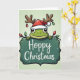This delightful digital drawing showcases a happy holiday frog 🎅🏼🎄🎁. The frog is a bright green color and wears a Santa hat with reindeer antlers. It has big, expressive black eyes that give off a sense of fun and joy. The frog is adorned with red and green Christmas lights wrapped around its hat and antlers, adding a festive touch. The background is a soft green color that fits well with the main colors of the frog.