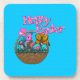 Hoppy Easter Basket is a graphics art design. A filled Easter basket with eggs, grass; chocolate and a pink bunny with a ribbon tied to the basket. Colours are pink and teal along with chocolate and the basket. Decorative Easter text reads: Hoppy Easter. Some products have a teal dots background, some products have the plain solid white.