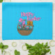 Hoppy Easter Basket is a graphics art design. A filled Easter basket with eggs, grass; chocolate and a pink bunny with a ribbon tied to the basket. Colours are pink and teal along with chocolate and the basket. Decorative Easter text reads: Hoppy Easter. Some products have a teal dots background, some products have the plain solid white.