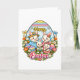 Wish your loved ones a "Hoppy Easter" with this bright and cheerful cartoon rabbit family illustration. Encased in a decorative egg-shaped frame filled with spring flowers and butterflies, this design features a sweet bunny family celebrating with colorful, patterned eggs. The bold primary colors and playful art style make this a perfect choice for kids' holiday greetings or fun family celebrations.