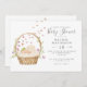Horisontal Baby shower invitation featuring a watercolor baby sleeping on a cloud in an easter basket with foliage, tulips and colourful hearts flying in the air.