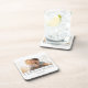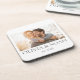 The Horizontal Gallery Bar coaster features a sleek horizontal photo strip across the top, a centered name in modern serif type, and a small sans serif subtitle with est. date below. Set on a clean white base, it offers a minimalist, contemporary way to showcase cherished memories.