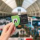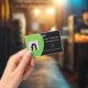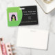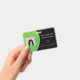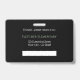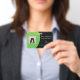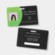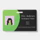 An horizontal black badge for any school staff member featuring part of a green apple . Personalise it with the employee's photo , name , job title , school name and the establishment's address . A small white rectangle is provided on the back for the teacher's signature or a bar code . This design is also available in other colour and in a vertical format . Click on the collection for more details .
