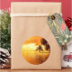 Round photo sticker with a horizontal palm tree hanging over the water of the pacific ocean during sunset on a tropical island.