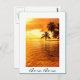 Postcard with a horizontal palm tree hanging over the water of the pacific ocean during sunset on a tropical island with a white border and the text: 'Bora Bora'.