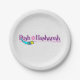 This design features the star of David and the shofar, which is a musical instrument made out of animal horns. This is celebrated as the "Head the Year" or New Year" for the Jewish community. A celebration that last for 2 days. Featured with blue for the horn and pink for the Star of David and burgundy for "Rosh Hashanah" A design that will fit on almost anything. This item is finished with a silver backround. These paper plates are available in 2 sizes. A great item for that magical celebration.