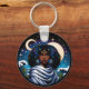 A fun horoscope sign Aquarius key chain with a pretty celestial illustration of a water bearer African-American woman in front of stars and a full moon/