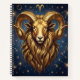 A mystical golden Ram Aries Astrology sign notebook with Aries dates and traits on the back, along with compatibility and other fun Aries facts.