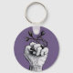 Witchy hand keychain with an ink drawing depicting a hand in fist with sharp black fingernails and a black ring with evil monsters with sharp teeth over purple background. Fun creepy creepy illustration with a gothic feel.