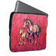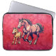A dynamic depiction of two horses, one larger and muscular with a flowing mane, and the other, a smaller foal, both portrayed in an energetic stance. They are set against a color background, emphasizing their strong forms and movement.
