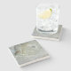 The coasters are gorgeous, a quality feel and heavy weight. They look like a precious archeological find. A rustic stone juxtaposed with a modern floral black and white print. I like the way the print goes slightly imperfect on the cut stone edges giving them a kind-of natural beauty.