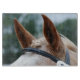 A strawberry roan horse stands at attention with ears forward as he waits to go into the show ring. This gelding pony is ready for English riding with his forelock braided and his English bridle. His dressage competition number can be spotted at the bottom right of the photo.