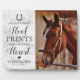 Equestrian memorial photo plaque featuring a treasured picture of your beloved horse, a trendy marble background, a horseshoe, heart, a sweet horse remembrance quote that reads "you left your hoof prints forever on my heart", plus their name, and dates.