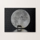 A fun and surreal image of a horse, large moon and raven with a reflection in the water.