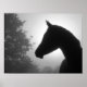 Profile of a beautiful Arabian horse silhouetted against foggy sunrise, an ethereal and serene image in black and white.