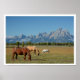 Photograph of three horses grazing in a pasture against the Teton Mountain Range in Wyoming.