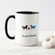 Digitally painted pair of horses - one light blue, the other a very dark blue - facing each other over a red heart, with the words "Be my Valentine". This mug can either be used by a left or right handed person, as the same design is on either side of the mug. You can easily insert your own words and change the colour of the background.